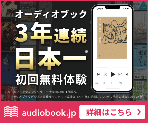 オーディオブックとは、書籍をプロの声優・ナレーターが読み上げた「耳で聴く本」。書籍や講演会を音声化したもののほか、語学、資格関連のCD、ラジオ音源、人気声優が朗読する作品など、 様々な内容の作品があります。・読みたい本はたくさんあるけど読む時間がない・毎日の通勤時間を有効に使いたい・目が疲れてしまうので耳から情報を取り入れたいそんな様々なライフスタイルに合わせて活用できる新しい読書の形として、オーディオブックは今多くの方に受け入れられつつあり、会員数は13万人、作品数は13,000作品となっております。----------------------------------------------------------