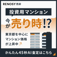 お持ちの投資用不動産の現在の価値をご存知ですか?RENOSY(リノシー)なら投資用不動産に特化した査定方法により、精度の高い価格提示が可能!累計2万件以上のAI査定実績があります。今なら投資用不動産をAI査定していただいた方に3,000Pプレゼント中!査定額は毎月更新。全ての機能を無料でご利用いただけます。----------------------------------------------------------